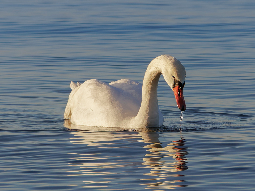 Julafton 2025 förmiddag. Öresund söder om Helsingborg. En i ett svanpar som njöt av det stilla vattnet. Bilden är ganska hårt beskuren